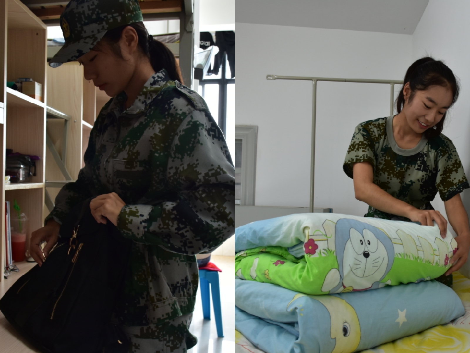 军训的磨炼并不仅仅存在于操场上的几分钟,更深的要求体现在对个人品质,性格特点、生活习惯的严格要求上。起床梳洗之后,徐欣怡进行了简单的内务整理。叠被子、铺床单、收拾宿舍,虽然是我们日常的小事,但徐欣怡做得一丝不苟。