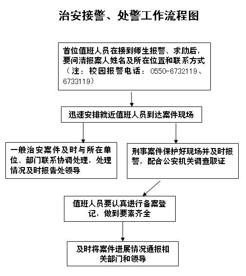 24小时受理报警、求助;接到报警或求助后,值班人员要在第一时间指挥就近保卫人员迅速到达现场。校内24小时报警电话:0550—6732119,0550—6733119。