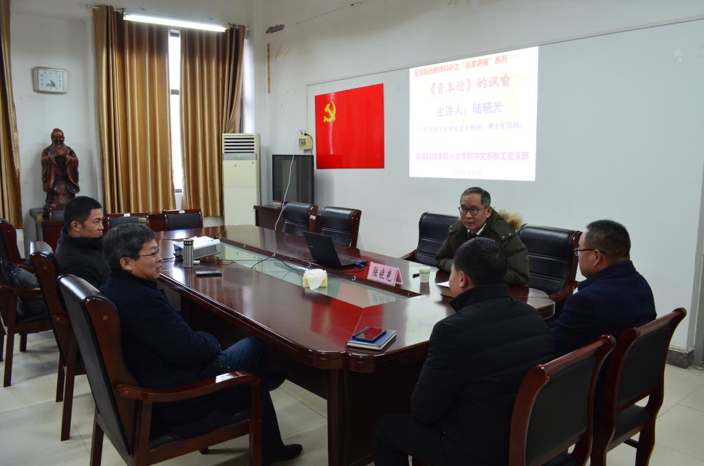 为深入推进“不忘初心、牢记使命”主题教育,认真落实安徽省创建“党建工作样板支部”工作要求,12月4日下午,人文学院中文系教工党支部举行“支部服务教师科研”学术活动,邀请华东师范大学中文系博士生导师陆晓光教授作《<资本论>的讽喻》专题报告,中文系全体教师在学院会议室参加报告会。