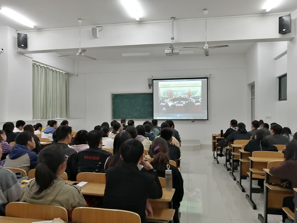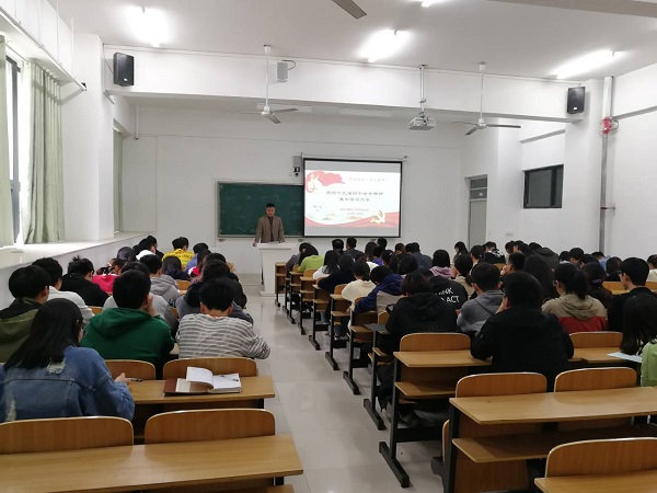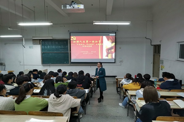 为扎实开展“不忘初心、牢记使命”主题教育,认真贯彻落实习近平新时代中国特色社会主义思想和党的十九大、十九届四中全会精神,了解我国当前的形势与任务,准确理解国家政策,增强当代大学生的使命感和责任感,11月7日晚,外国语学院在求A103教室举行了题为“扣好人生第一粒扣子”的形势政策报告会。报告会由学院党总支书记蔡为青担任主讲,学院主要学生干部及学生代表共100余人参加报告会。