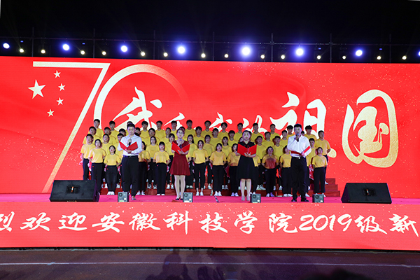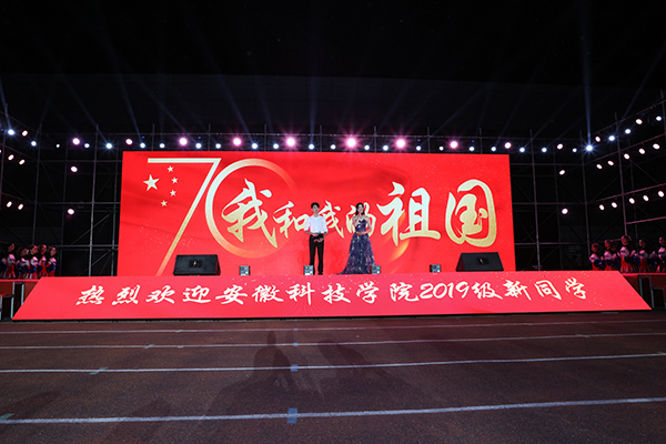 金秋好赋,盛世当歌。9月23日、25日晚,我校庆祝新中国成立70周年暨2019年迎新文艺汇演分别在凤阳、龙湖校区体育场盛装开演。校党委书记蒋德勤,党委副书记韦文联,党委委员、纪委书记丁和生,党委委员、副校长郭亮,党委委员、副校长黄远友等党政领导出席观演,中国人民解放军陆军装甲兵学院蚌埠校区乘员训练队指导员、凤阳校区军训团团长陶靓成,教练勤务营连长、龙湖校区军训团团长刘伟伟,蚌埠医学院团委书记周静,蚌埠团市委副书记、安徽财经大学团委副书记杜斌应邀参加与两校区师生共同欣赏精彩演出,共庆新中国70华诞,喜迎2019级萌新。