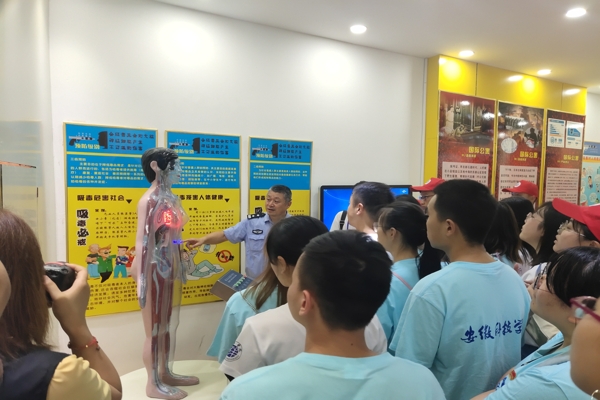 11日下午,大学生们志愿者来到了蚌埠市禁毒教育基地,禹会区公安分局禁毒大队副队长张泽结合展厅生动的图片、文字、视频、实物以及仿真毒品等进行了精彩详细的讲解,生动形象地介绍了禁毒历史、禁毒成果、法律法规、毒品危害等知识,以及毒品给个人、家庭、社会带来的危害。同学们参观了十数种仿真毒品和一个个鲜活案例及图片,学习了禁毒警示教育三字经,还观摩了毒品血液循环模型进行了鼻吸、口服、静脉注射、肌肉注射毒品等对人体的危害过程及后果的演示,观看了国家禁毒委大型禁毒专题纪录片《与死神共舞》。