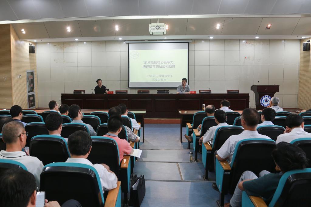洪成文教授从高校核心竞争力的内涵与应用、地方高校核心竞争力建设的挑战与问题、地方高校培育核心竞争力的经验、核心竞争力未来发展的趋势等四个方面,结合我校事业发展的实际情况,通过分析国内部分高校改革发展及国外高校的跨越式发展的案例,生动介绍了地方高校发展的内涵、模式与途径,认为首先要立足地方做贡献,在为区域发展提供人才上下功夫,人才培养与社会服务紧密对接地方区域经济建设;要明确办学定位,强化内涵建设,从区域历史文化、社会定位等方面挖掘和打造自身独有的办学特色;要讲好学校发展的故事,善于依据政策争取政府投入并谋求广泛的社会力量支持,高度重视高水平人才的引进与师资队伍的能力提升,不断提升高校的社会影响力和教师的获得感、幸福感。