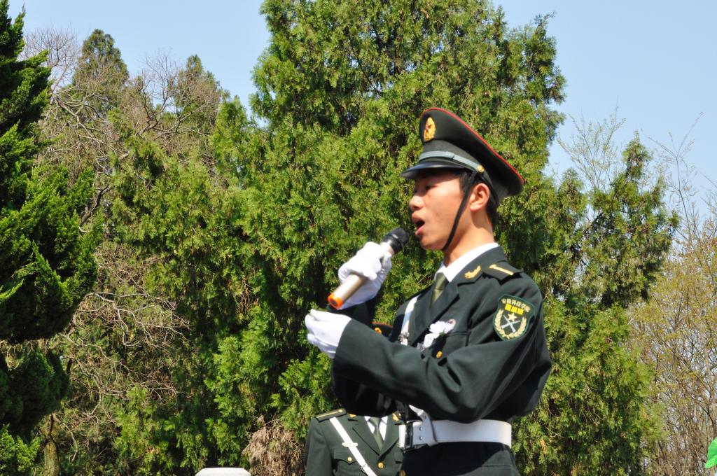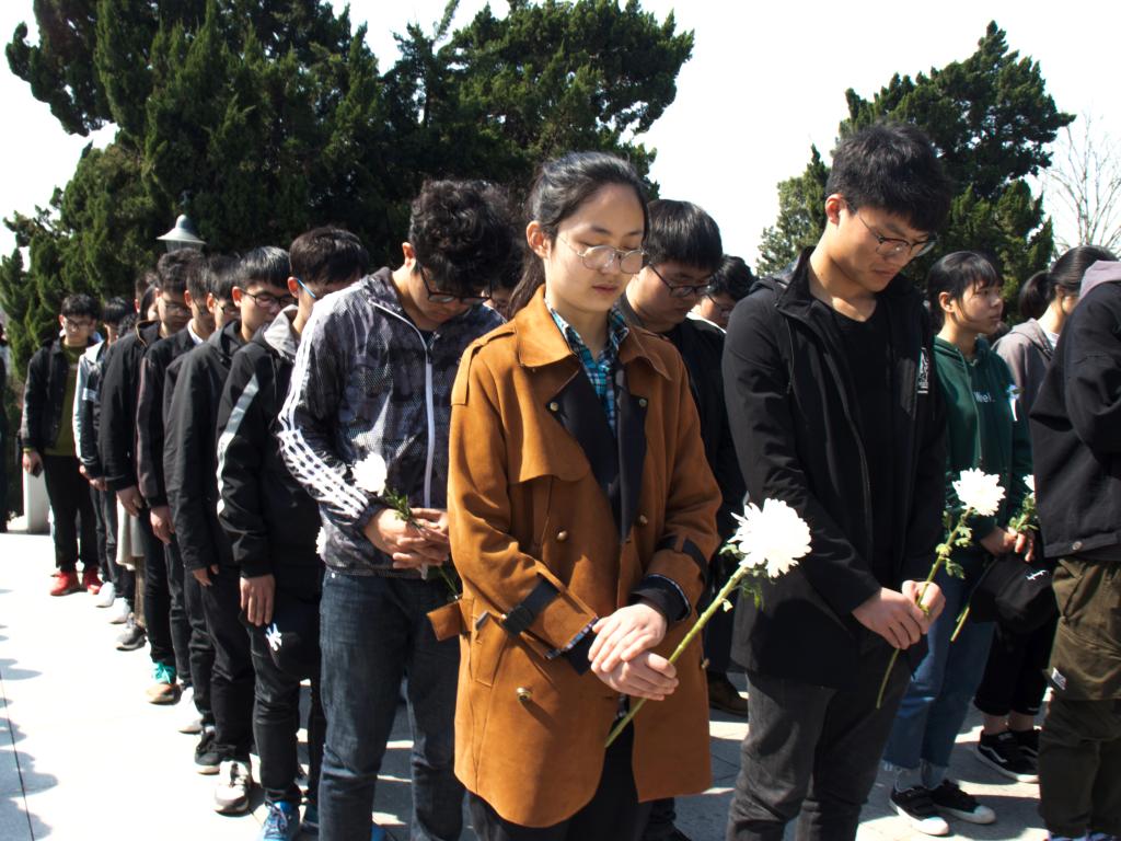 当天上午,风清日明,天朗云舒,劲柏苍翠。祭扫现场庄严肃穆,在红旗翠柏的掩映下,活动正式开始。伴随着国旗班铿锵有力的脚步行进声,18名礼兵护卫花圈,正步向前,拾级而上,将花圈摆放在高耸的烈士纪念碑前。随后,在国旗班队员洪皓正的带领下,全体学生庄严宣誓,洪亮的誓词掷地有声,久久回荡在纪念碑前。接着,全体脱帽肃立,向为民族独立、人民解放和国家富强、人民幸福英勇牺牲的烈士默哀。阳光下屹立的大理石纪念碑和学生们一同静默,天空湛蓝高远。默哀完毕,各社团组织代表上前献花,瞻仰烈士纪念碑,表达追念和崇敬之情。活动最后,来自国旗班的学生代表孙珂上台发言,用深情的讲述,激起现场学生内心深沉的爱国之情。