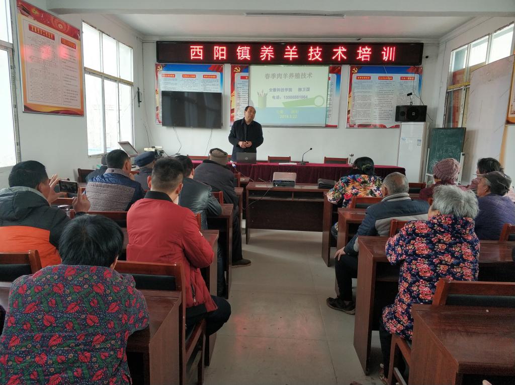 3月22日下午,在我校定点帮扶村涡阳县西阳镇王桥村的礼堂里,座无虚席,来自全镇12个行政村的百余名畜禽养殖户正在聚精会神听取柳卫国教授的养羊技术讲座。农户们时而认真做笔记,时而举手咨询有关养殖问题,柳卫国耐心的为他们解惑答疑。讲座之后,柳卫国、张伟等在扶贫工作队丁景良、张海亮、余维发等同志引导下亲赴现场指导农户的山羊养殖技术。