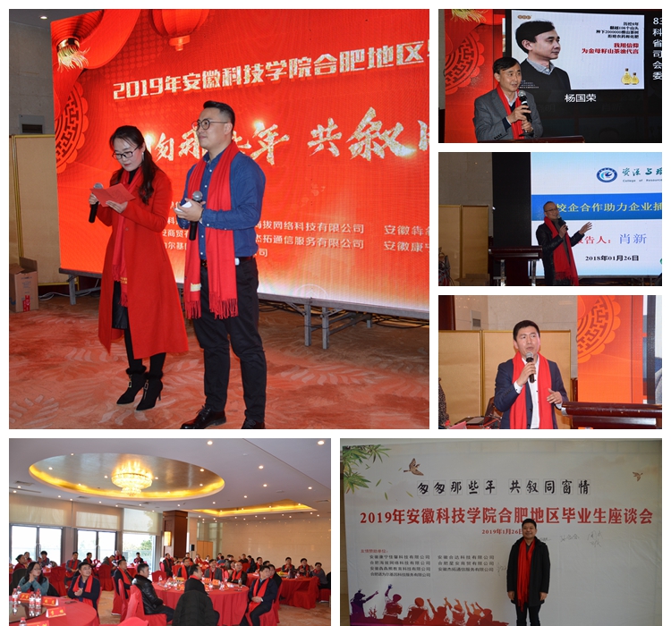 1月26日, 2019年安徽科技学院合肥地区毕业生代表座谈会在翡翠湖迎宾馆成功举办。党副书记韦文联,党委委员、副校长郭亮等应邀出席并讲话,座谈会由2002级资源与环境专业王宁、2005级计算机科学与技术专业杨森主持,合肥地区各届毕业生代表80余人参加会议。