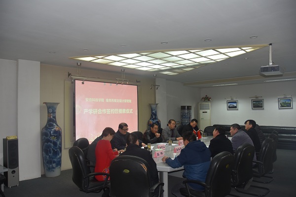 12月19日下午,我校与淮南市规划设计研究院签订产学研仪式在淮南规划院会议室举行。科研处副处长鲍方印,建筑学院院长张远兵、党总支书记傅友褔;淮南市规划设计研究院总支书记、副院长吴旻,副院长、总工孙学山和相关人员参加仪式。仪式由孙学山主持。