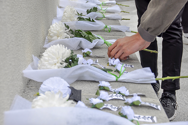 随后,来自爱心社、校卫队和武术协会的学生代表发表爱国主题演讲。伴随着《献花曲》,四名礼兵向烈士纪念碑敬献花圈,各组织同学紧随其后敬献白花。全体人员在纪念碑前行三鞠躬礼,向烈士表达崇高的敬意和深深的哀念。