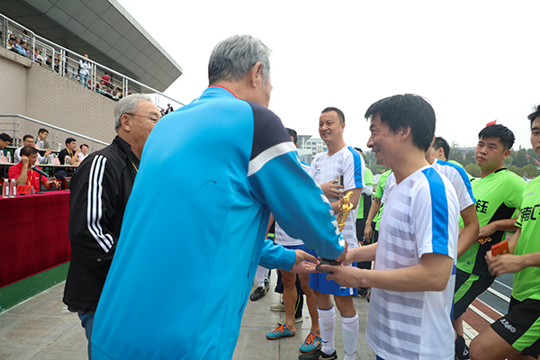 在次日下午的闭幕式上,公益慈善足球赛冠亚军决赛在我校西区风雨操场打响,经过激烈角逐,我校足球队荣获比赛二等奖。戚务生、马元安为我校队员颁奖并合影留念。