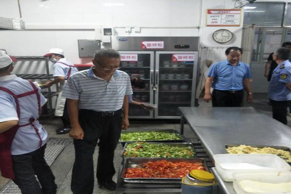 检查中,朱寰一行认真查阅了学生食堂安全卫生管理制度、职工培训健康证、采购索票索证、原材料采购验收台账、食品留样及餐具洗消记录等,现场抽检勘验了部分原材料的质量及存储情况,重点是猪肉及猪肉制品的“两章两证”及食堂泔水的无害化处理记录。逐一检查了库房、切配间、烹饪间、洗消间等区域的卫生保洁和物品摆放,并听取了饮食服务与监管中心主任叶浩在加强食品卫生安全工作上的做法,特别是对“非洲猪瘟”疫情的防控措施及预案。检查人员还依据《安徽省餐饮服务行业食品卫生监督动态等级评定标准》对我校食堂进行了现场打分。