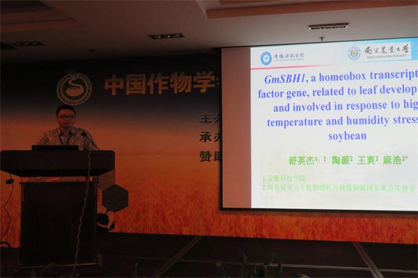 舒英杰副教授作了题为“ISOLATION AND EXPRESSION ANALYSIS OF GmSBH1,WHICH INVOLVE IN PRE-HARVEST SEED DETERIRATION”的大会报告,并提交了“GmSBH1, a homeobox transcription factor gene, relates to growth and development and involves in response to high temperature and humidity stress in soybean”的Poster。