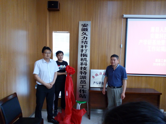 随后鲍方印、侯传宇、久力机械设备有限公司负责人共同为安徽科技学院产学研基地及科技特派员工作站揭牌。揭牌仪式后,省四送一服领导小组相关人员,鲍方印及萧县四送一服相关人员在久力机械设备有限公司开展了四送一服活动。