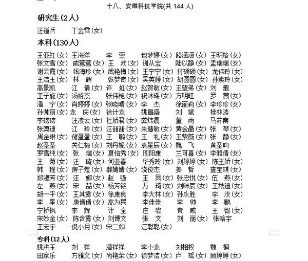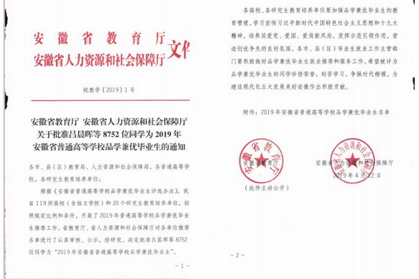 日前,安徽省教育厅、安徽省人力资源和社会保障厅下发了《关于批准吕晨晖等8752位同学为2019年品学兼优毕业生的通知》(皖教学〔2019〕1号),我校汪道兵等144名同学被授予“2019年安徽省普通高等学校品学兼优毕业生”荣誉称号。
