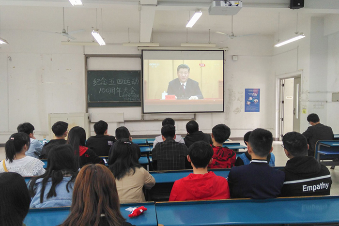 4月30日上午,纪念五四运动100周年大会在人民大会堂隆重举行。中共中央总书记、国家主席、中央军委主席习近平出席大会并发表重要讲话。我校各级团学组织组织学生党员、干部、团员青年在会议室、教室、宿舍等地观看了大会盛况直播,学习习近平总书记重要讲话精神。同学们纷纷表示总书记对青年的关心和重视让大家备受鼓舞,通过观看和聆听,对五四精神的历史意义和时代价值有了新的认识,将继续弘扬“五四精神”,自觉把“青年梦”融入“中国梦”之中,不断增强团员意识,践行团员先进性,积极学习,努力提高自身素质和能力,充分发挥共青团员的先锋模范作用。