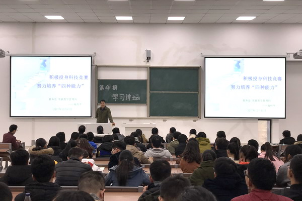 为充分发挥学科和技能竞赛的实践育人作用,根据本学期学习讲坛活动安排,学生处于12月13日下午在龙湖校区致知楼B111教室举办第四期学习讲坛。教务处实践教学管理科科长宛传平应邀作了题为“积极投身科技竞赛,努力培养“四种能力”的专题辅导报告。龙湖校区200多名学生代表聆听了报告。报告会由学生处副处长何华奇主持。