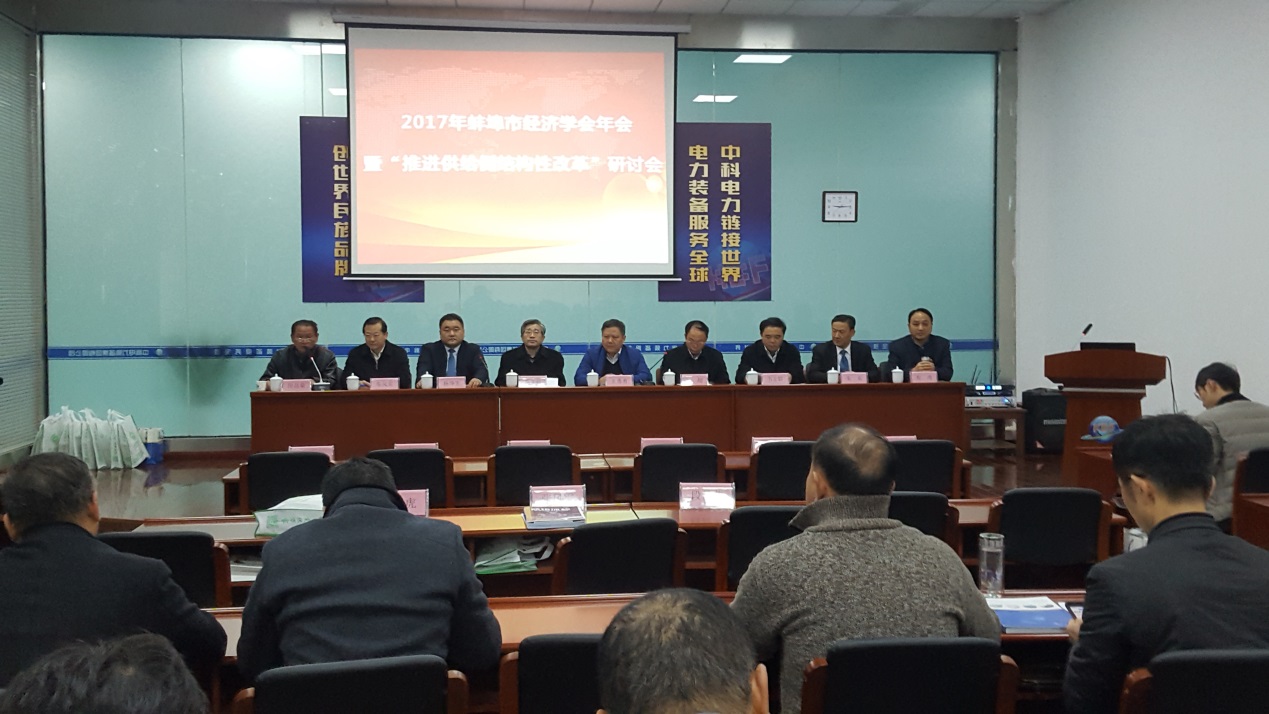11月25日,蚌埠市经济学会专家学者,蚌埠市政府相关职能部门、企业家代表近百人齐聚中科电力装备集团有限公司,参加蚌埠市经济学会2017年年会暨“学习贯彻十九大精神,助力蚌埠供给侧结构性改革”研讨会。我校党委副书记韦文联、校学术委员会副主任胡月英、管理学院院长赵伟峰、财经学院副院长金怀玉及管理学院、财经学院部分教师应邀参会。蚌埠市政协副主席王勇勇、中科电力装备集团有限公司总经理杨坤生应邀出席会议并讲话,会议由学会秘书长段昌荣主持。