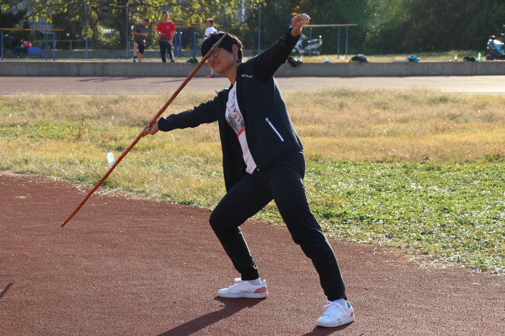 一道矫健的身影,一只空中飞出的标枪,还未收回的姿势,十七号运动员的标枪在空中划出了一道优美的弧线,之后完美地插在了地上。赛后,我们有幸采访到了这位编号为17的女生,她就是来自农学院的邹培。