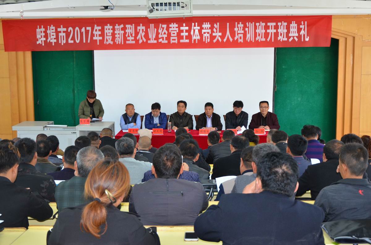 为造就一支综合素质高、生产经营能力强、主体作用突出的新型职业农民队伍,蚌埠市农林委委托我校举办蚌埠市2017年度新型农业经营主体带头人培训班,参训学员主要为五河县生产经营型或粮食种植专业的50名新型职业农民。4月9日上午10点,在校学知楼216教室举行了开班典礼,我校继续教育学院副院长杨维来、张敬强,蚌埠市农林委副主任宋志、科教科科长时元增、五河县农委总农艺师陈孝文、科教科科长王志刚、农广校校长孙枫等及50名学员出席了典礼,典礼由孙枫主持。