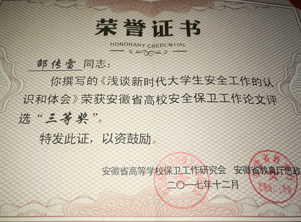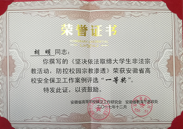 为进一步提高高校保卫工作精细化水平,为广大保卫工作者提供有效工作指导,安徽省高等学校保卫工作研究会下发了《关于安徽省高校安全保卫工作案例评选的通知》。通知下发后,学校高度重视此次评选活动,积极组织人员撰写案例及论文评选申报,鼓励结合日常工作,做好总结和梳理,立足岗位实际凝练典型经验,展示特色工作成果,提升理论研究水平。经学校推荐申报,网上查重及省内外专家组织评审,最终案例《坚决依法取缔大学生非法宗教活动,防控校园宗教渗透》具有较强代表性,脱颖而出,喜获一等奖,《完善校地防动机制 维护校园安全稳定》与《浅谈新时代大学生安全工作的认识和体会》分获三等奖的优异成绩。安徽省高等学校保卫工作研究会将对本次获奖论文和案例汇编并向全省高校推广。