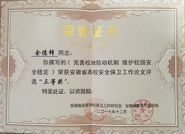 12月28日,由安徽省高等学校保卫工作研究会、安徽省教育厅思政处联合举办的安徽省高校安全保卫工作案例、论文评选结果揭晓,我校保卫处胡明撰写的案例——《坚决依法取缔大学生非法宗教活动,防控校园宗教渗透》荣获一等奖,余德锋撰写的论文《完善校地防动机制 维护校园安全稳定》与邵传雷撰写的论文《浅谈新时代大学生安全工作的认识和体会》分别荣获三等奖的佳绩。