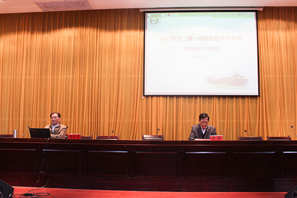 11月15日下午,南京农业大学学术委员会主任、国家973计划首席科学家沈其荣教授应邀在新图书馆二楼学术报告厅做了一场题为《静心尽力,做一名称职的大学教师》的学术报告。校党委副书记、校长李震,党委委员、副校长汪建飞出席报告会。报告会开场由李震主持。