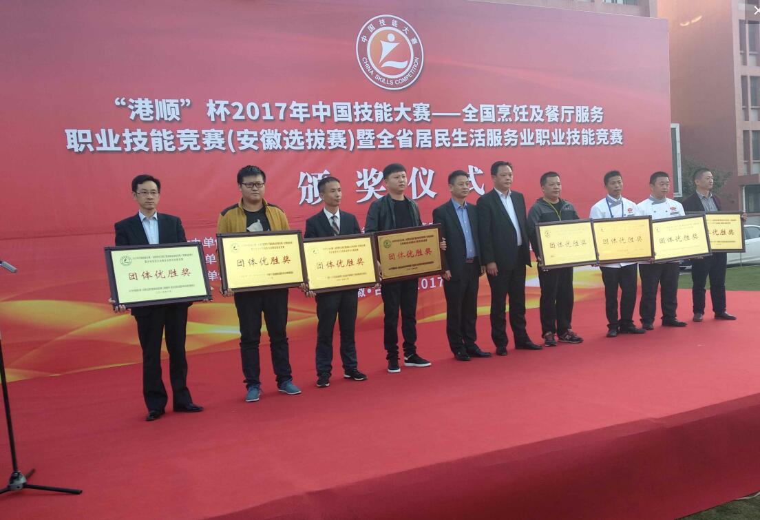 “港顺”杯2017年中国技能大赛——全国烹饪及餐厅服务职业技能竞赛(安徽选拔赛)暨全省居民生活服务业职业技能竞赛由安徽省商务厅、安徽省人力资源和社会保障厅、安徽省总工会、共青团安徽省委、安徽省妇女联合会主办,由安徽省烹饪协会、安徽省职业技能鉴定中心、安徽省财贸轻纺烟草工会、安徽新东方烹饪学院承办的餐饮界一次盛会。大赛面向全省餐饮酒店及机关企事业单位厨师和餐厅服务人员,共有160余位选手参赛,我校吴晓伟老师带领周干、刘加上两名烹饪与营养教育专业学生参加了中餐热菜、冷拼雕饰、中式面点三个项目的角逐。我校获团体优胜奖,吴晓伟、沈德艳获得最佳指导教师奖。