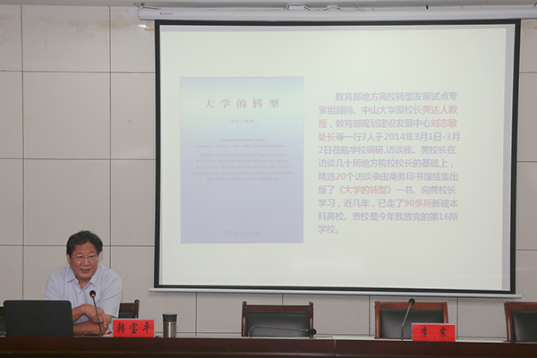全国新建本科高校联盟名誉理事长、教育部学校规划建设发展中心“高等学校产教融合创新试验项目”首席专家、徐州工程学院原校长、二级教授韩宝平作了题为《应用型高水平大学建设的若干问题》的首场辅导报告。报告会上,韩宝平教授分析了应用型高水平大学建设的背景与由来,阐述了国际高等教育新理念与知识创新模式、提出了“专业集群建设”、“双师双能型”队伍建设、“产教融合、协同育人”等发展思路。他还结合全国兄弟院校走“产教融合,校地校企合作”的成功经验,对我校转型发展以及应用型人才培养提出了宝贵的意见和建议。报告既有理论深度又有生动实例,分析透彻,极富感染力和吸引力,对我校地方应用型高水平大学建设具有非常强的指导性和针对性。