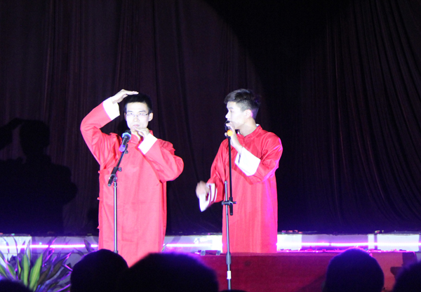 如果说篇章二是热情,那篇章三揭开的就是“岁月静好”的平淡,《潇洒女兵》,飒爽英姿,气质非凡,不禁让我们想起军训的时光,虽然艰辛但磨练了我们的体魄和意志;长恨一曲千古迷,长恨一曲千古思,一曲反串《梨花颂》,让我们领略了京剧之美;由王懂懂、刘岗表演的相声《从小玩到大》,引得台下笑声连连。即将进入的社会如此喧嚣,同学们更需要另辟一个静美的世界,安放心灵。最后一个篇章“前途似锦”,包含着对毕业生们最真挚的祝愿,由46期党课学员演唱的红歌串烧《没有共产党就没有新中国》、《团结就是力量》、《我们走在大路上》传递着自己的信仰,相信前方的路不再迷茫;《盛世中华》压轴登场,盛世欢曲,载歌载舞,荡气回肠,在这热烈的气氛下,晚会也就此落下帷幕。