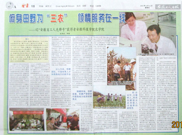 6月12日《安徽工人日报》2A版以“《俯身田野为“三农”,倾情服务在一线》——记“安徽省工人先锋号”获得者安徽科技学院农学院”为题报道了我校农学院先进事迹。具体报道如下: