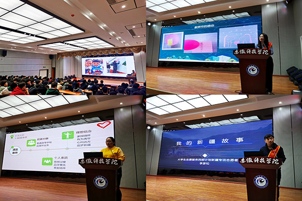 宣讲会在西部计划新疆专项志愿服务的主题宣传片中拉开帷幕。在岗志愿者李彦松分享了在新疆志愿支教的经历,描述了新疆的壮美与广袤,讲述了新疆人民的淳朴与善良,他表示,“青年当有志,立志在四方,祖国需要处,皆是我故乡。”在岗志愿者王丽丽也分享了自己由一个即将毕业的学生到正式支教的心路历程故事,深刻理解了老师的意义,“学高为师、身正为范”是他收获的道理。留疆志愿者田慧慧说,“志愿西行就是我青春的诗和远方”,她介绍了许多新疆的风土人情,分享了不少在新疆服务的趣事,使同学们全面认识到新疆的美丽、发展迅速和安全稳定。