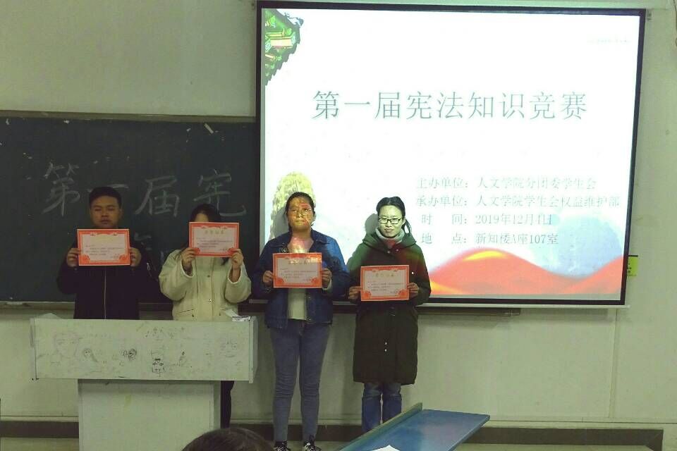 4号下午,在新知楼A105和107教室,人文学院又举办了宪法知识竞赛。通过赛前的充分准备,参赛选手们都对宪法知识有了较为全面的认识,面对小组赛中紧张激烈的抢答、必答等环节,选手们也都显得胸有成竹、处变不惊,有条不紊的回答问题。经过一段时间的比拼和团队成员间的协同作答后,最终,“不殆”队一马当先、拔得头筹,获得比赛一等奖;“最强大脑”队、“法法”队获得比赛二等奖,“尼姑庵”小分队、“法寓行”队、“啥都对”队获得比赛的三等奖,“阁下”队、“温柔一刀”队、“文武双全”队、“看心情”队获得优秀奖。而相对于比赛的结果,选手们收获更大的是头脑中的知识和思想上的洗礼。(特约通讯员:李沙娜)
