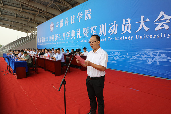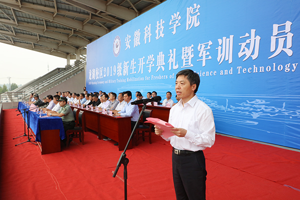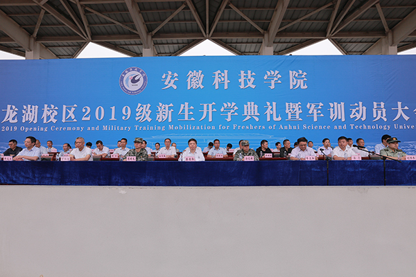 9月17日上午,我校蚌埠龙湖校区2019级新生开学典礼暨军训动员大会如期召开。校党委书记蒋德勤,党委副书记韦文联,党委委员、纪委书记丁和生,党委委员、副校长郭亮,党委委员、副校长黄远友,解放军陆军装甲兵学院蚌埠校区学员九大队大队长孙文彬,陆军装甲兵学院蚌埠校区教练勤务营教导员陈明龙,教练勤务营连长、龙湖校区军训团团长刘伟伟等出席大会并在主席台前排就座。大会由郭亮主持。