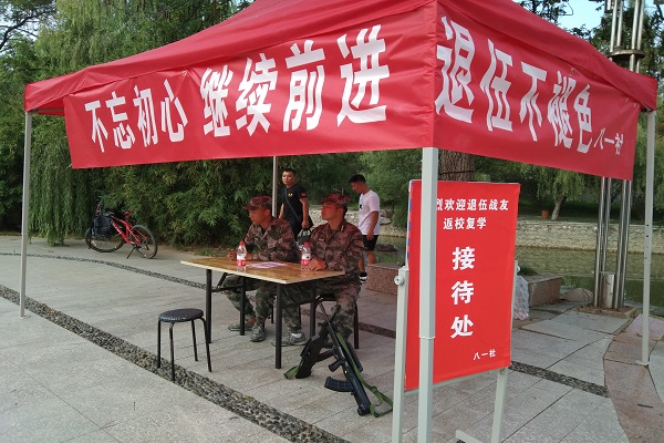 “热烈欢迎退伍战友返校复学”,在凤阳校区西区天桥下这样一个帐篷格外引人注目,这是我校八一社特意为迎接退伍军人这样一群特殊的新生而设置的服务点。