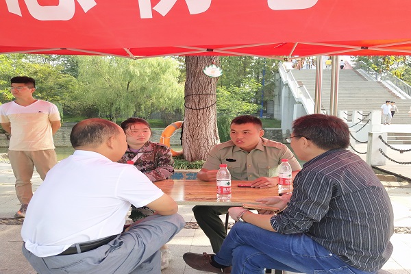 八一社的服务点不仅为迎接退伍复学的战友,还为想要了解参军条件、政策的同学及家长提供讲解。他们所做的正如帐篷上的横幅一样:不忘初心,继续前进,退伍不褪色!