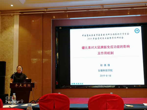 中国农业大学夏兆飞教授、湖南农业大学文利新教授分别进行了“国内宠物医院发展现状、存在问题及思考”、“猪油预防2型糖尿病及其并发症的功能发现”专题报告。随后,大会分多个主题在三个会议室进行了100多场专题报告。我校动物科学学院教师胡倩倩做了“硼元素对大鼠脾脏免疫功能的影响及作用机制”,向与会代表介绍了所在团队近年来的科研成果及进展。