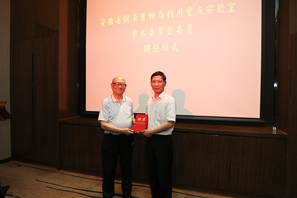李震宣读了《关于聘请盖钧镒院士等同志为饲草育种与利用安徽普通高校重点实验室学术委员会委员的决定》,经各委员推荐,报校长办公会研究,决定聘请中国工程院院士、南京农业大学盖钧镒教授、中国农业大学张英俊教授、南京农业大学沈益新教授、四川农业大学张新全教授、甘肃农业大学师尚礼教授、安徽农业大学马传喜教授、董召荣教授、安徽科技学院王立克教授、李孝良教授等9人为饲草育种与利用安徽普通高校重点实验室学术委员会委员,聘任盖钧镒院士为饲草育种与利用安徽普通高校重点实验室学术委员会主任。李震为第一届学术委员会主任及委员颁发聘书。实验室学术委员会委员聘任仪式由我校农学院院长、饲草育种与利用安徽普通高校重点实验室主任詹秋文教授主持。