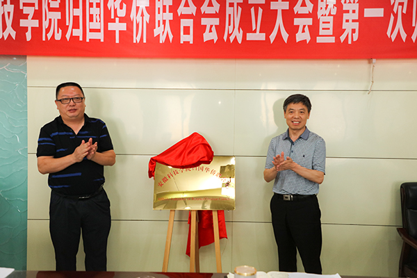 蒋德勤和刘国东共同为学校归国华侨联合会揭牌。