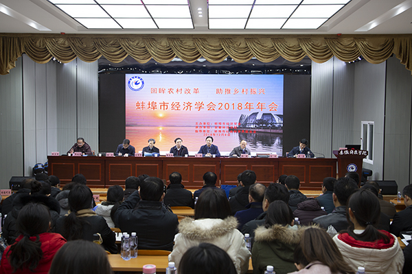 12月8日上午,由蚌埠市经济学会主办、安徽科技学院承办的2018年蚌埠市经济学会年会在安徽科技学院(龙湖校区)敏行楼一楼报告厅举行。本次年会围绕“回眸农村改革 助推乡村振兴”主题展开学术交流与研讨,来自蚌埠市经济学界的100余位专家、学者出席了此次研讨会。我校党委副书记韦文联,安徽财经大学党委常委、纪委书记宣扬,蚌埠市原政协副主席徐超和蚌埠市社会科学界联合会主席胡兵等出席开幕式,开幕式由蚌埠经济学会秘书长段昌荣主持。