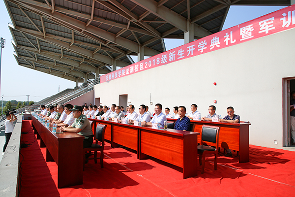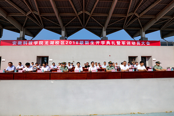 时维九月,硕果满枝。9月11日上午,我校龙湖校区2018级新生开学典礼暨军训动员大会在田径场举行。校党委书记蒋德勤,党委副书记、校长李震,党委副书记韦文联,党委委员、纪委书记丁和生,党委委员、副校长汪建飞,党委委员、副校长郭亮,党委委员、副校长黄远友,解放军陆军装甲兵学院蚌埠校区学员九大队政委王昭、九大队副大队长顾成国、九大队连长龙湖校区军训团团长刘伟伟等有关领导出席大会并在主席台就座。大会由汪建飞主持。