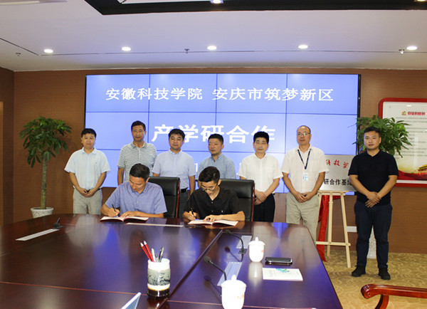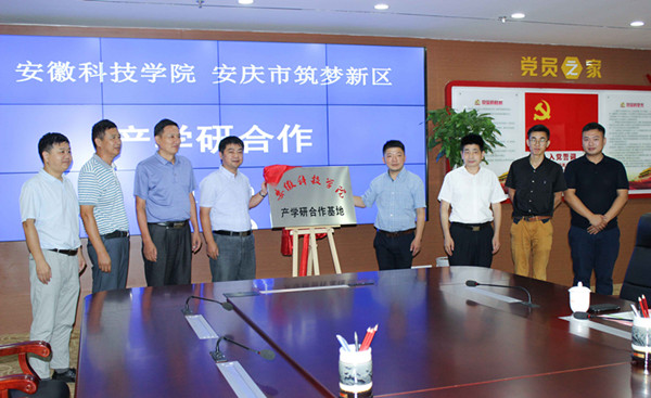 汪建飞、查盛生代表校企双方为“安徽科技学院产学研基地”揭牌,李孟良、郝刚代表校企双方签署了产学研合作协议。