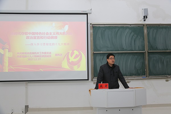 12月27日下午,学校在龙湖校区致知楼C111举行党的十九大精神宣讲报告会,蚌埠市理论专家宣讲团成员、蚌埠市直机关工委副书记胡凤芝作宣讲报告,报告会由党委组织部副部长钱锐主持。龙湖校区师生代表200余人聆听了报告。