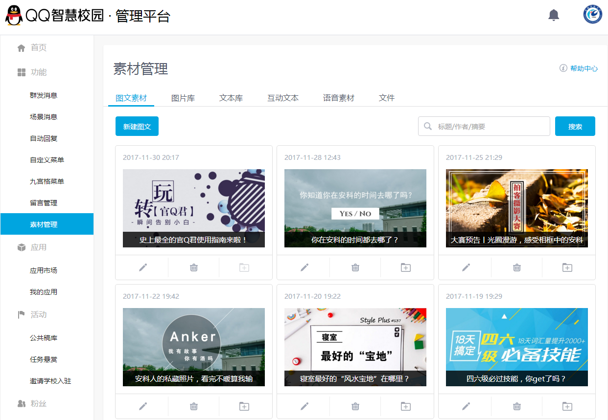 打造安徽科技学院QQ公众号,粉丝量达14500余人,发送图文推送375篇,单篇最高阅读量11000+,2016年获得全国优秀QQ公众号奖项。