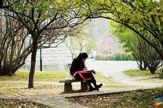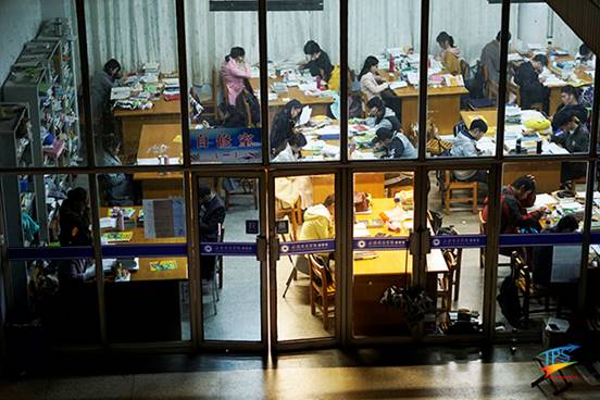 阅览室里,每个人的桌子上的书堆成高高一摞,他们在这书山后埋头苦干、奋笔疾书。这里,没有喧哗吵闹,只有轻浅的呼吸声、只有笔尖与书页交错的沙沙声、只有心中渴望知识的呐喊。