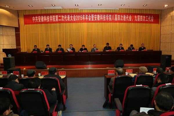 腊月的安科,蕴含无限希望,充满勃勃生机。1月19日上午,中共安徽科技学院第二次代表大会2015年年会暨校八届四次教代会、九届四次工代会在会议中心二楼报告厅隆重召开。校党委书记蒋德勤,党委副书记、校长陈士夫,党委副书记韦文联,党委委员、纪委书记丁和生,党委委员、副校长汪建飞,党委委员、组织部长黄远友,党委委员、教务处长郭亮,党委委员、宣传部长卫胜,党委委员、党委(校长)办公室主任曾献功,校工会主席李永生等出席开幕式并在主席台就座。蒋德勤主持大会,并宣布大会开幕。大会应出席正式代表201名,实到会正式代表190名。