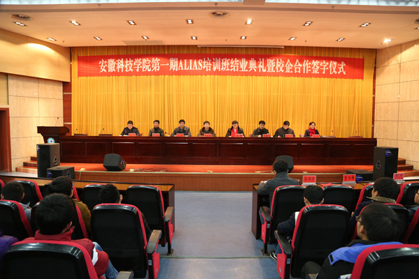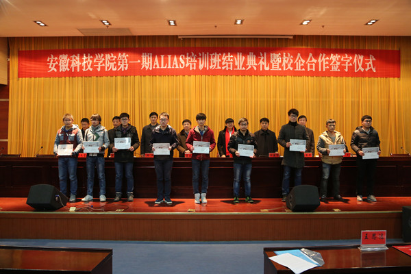 12月25日下午,ALIAS第一期培训班结业典礼暨校企合作产学研教育基地签字仪式在会议中心二楼报告厅举行。校党委书记蒋德勤、副校长汪建飞,蚌埠市人社局副局长张坦,蚌埠市原科技局局长郭长友,安徽后青春工业设计研究院院长王峰等领导和来宾出席签字仪式。