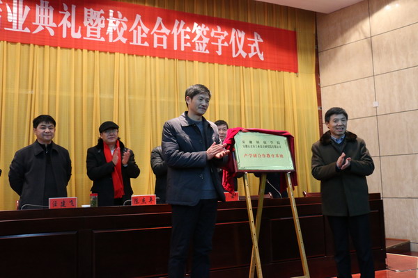 蒋德勤和张坦共同为校企合作产学研教育基地揭牌。汪建飞和王峰共同签署合作协议。