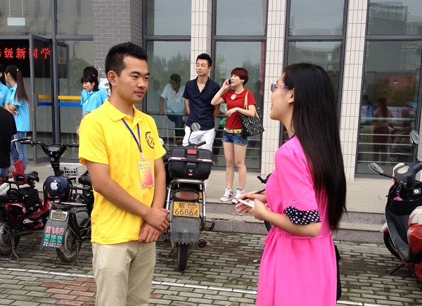 我们眼前这个身着“黄马褂”的动科院志愿者苗伟,满头大汗的他刚送完一个新生到东区宿舍,那边忙完便立即过来准备迎接下一批学生。他告诉我们学生记者,今天是新生报道的第一天,人流量比较大,从早6点到现在仅3个小时时间他就已经接了7个新生了。“这份工作让我肩负使命,不为得到什么,只希望能为迎新奉献个人点滴。”苗伟采访时说。因为他们无私的奉献,给自己学院的迎新工作带来了极大的便利。