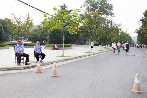 进入校园,在满目斑斓的色彩中,一片蓝色的身影格外醒目。整齐的制服,挺拔的站姿,非凡的气质。他们就是有“校园护卫”之称的校卫队,有的负责指引新生,有的负责引导车辆停放,有的负责维持报名现场秩序……他们各司其职,确保迎新现场的安全有序。