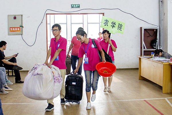 校车刚停稳,就清楚能听见有人在吆喝:“动科院”、“生科院”等。志愿者们一拥而上,迫不及待迎接自己学院的新生。他们不仅担任着迎新的任务,还会为新生做足“全套服务”:引导新生报道注册,缴纳学费,领取物品,去宿舍安顿及办理饭卡等。