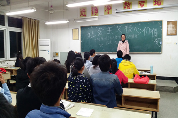 各班级分别召开主题班会组织宣传、学习社会主义核心价值观主要内容,深刻领会富强、民主、文明、和谐、自由、平等、公正、法治、爱国、敬业、诚信、友善等国家层面、社会层面、公民个人层面的含义,并围绕习近平总书记在与北京大学师生座谈讲话时提出的“勤学、修德、明辨、笃实”的八字要求开展热烈讨论。同学们纷纷表示,在成长成才的过程中要养成良好的道德行为规范,既要做中华传统美德的传承者,也要做社会主义核心价值观的践行者,真正成为有担当、有责任感的社会栋梁。